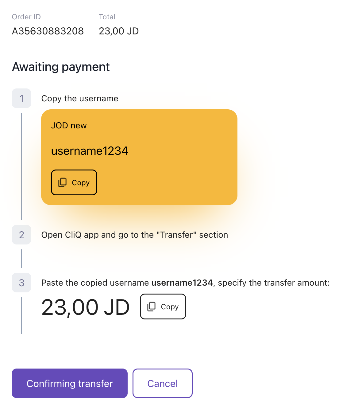 Transfer type | Transfer via username (CliQ) |