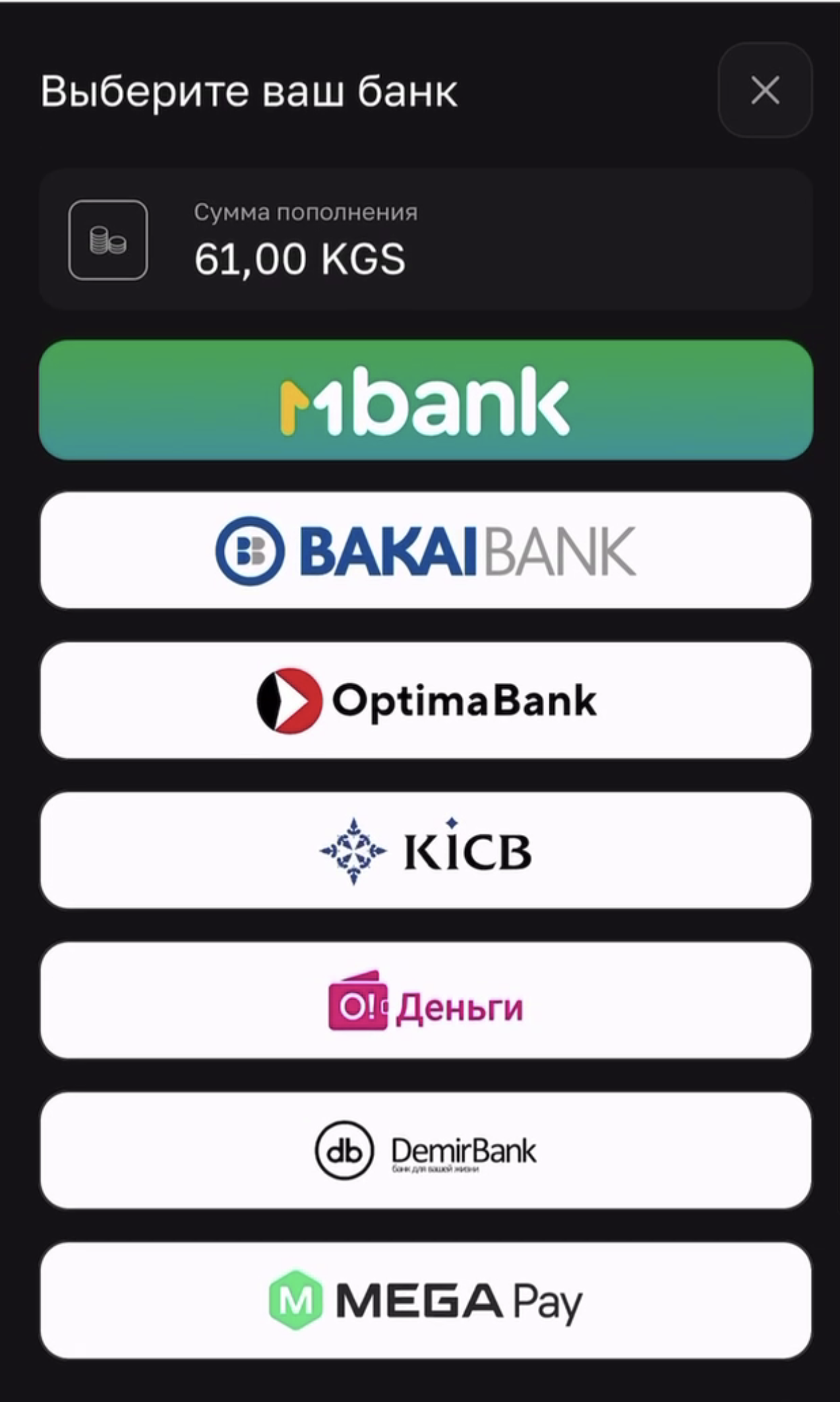 bakai, mbank, kicb, odengi, demir, megapay