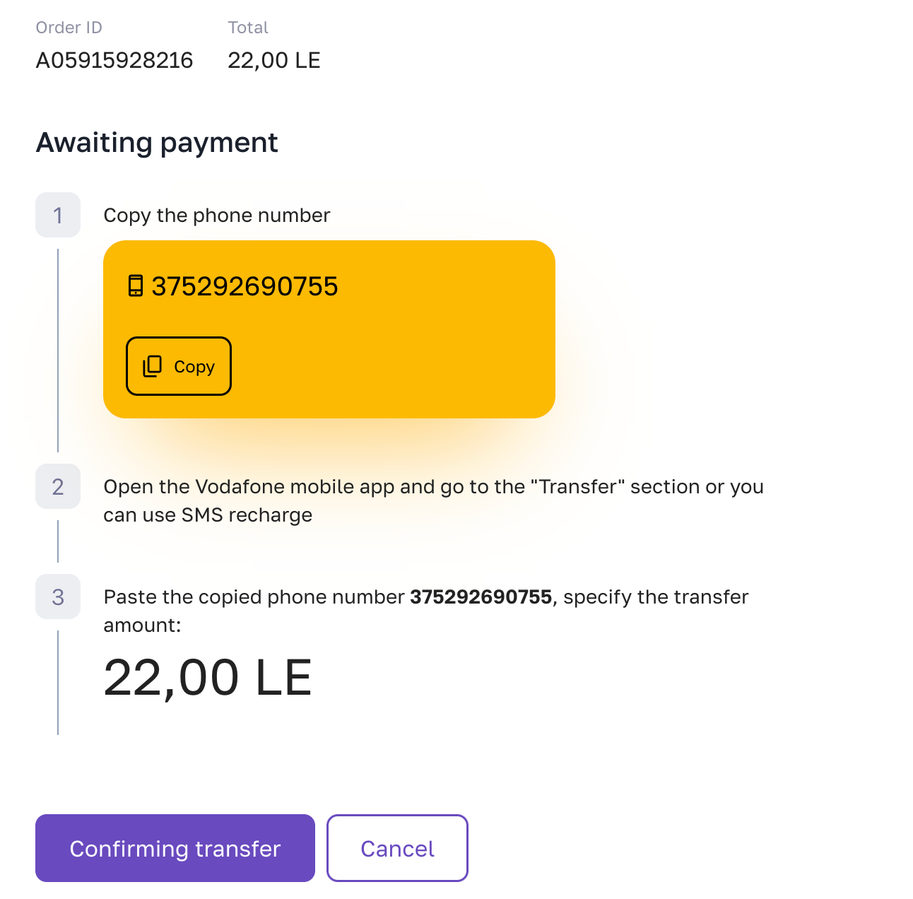 Transfer type | Transfer via mobile wallet (Vodafone Cash) |