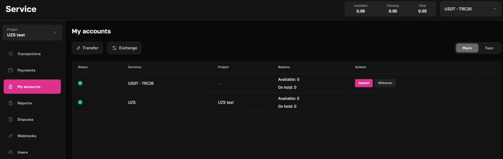 In this section, on the Main tab, you can observe both crypto and fiat accounts in the chosen currency.
