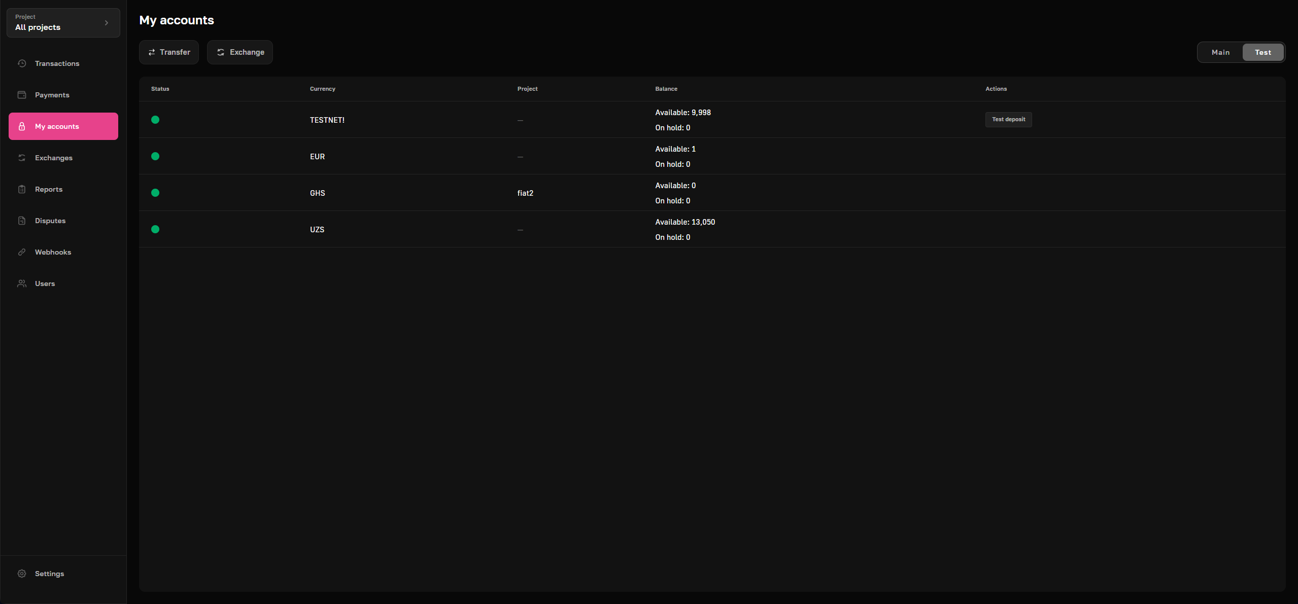 After the project is created, navigate to the My accounts section. You’ll see your newly created fiat account in the chosen currency.