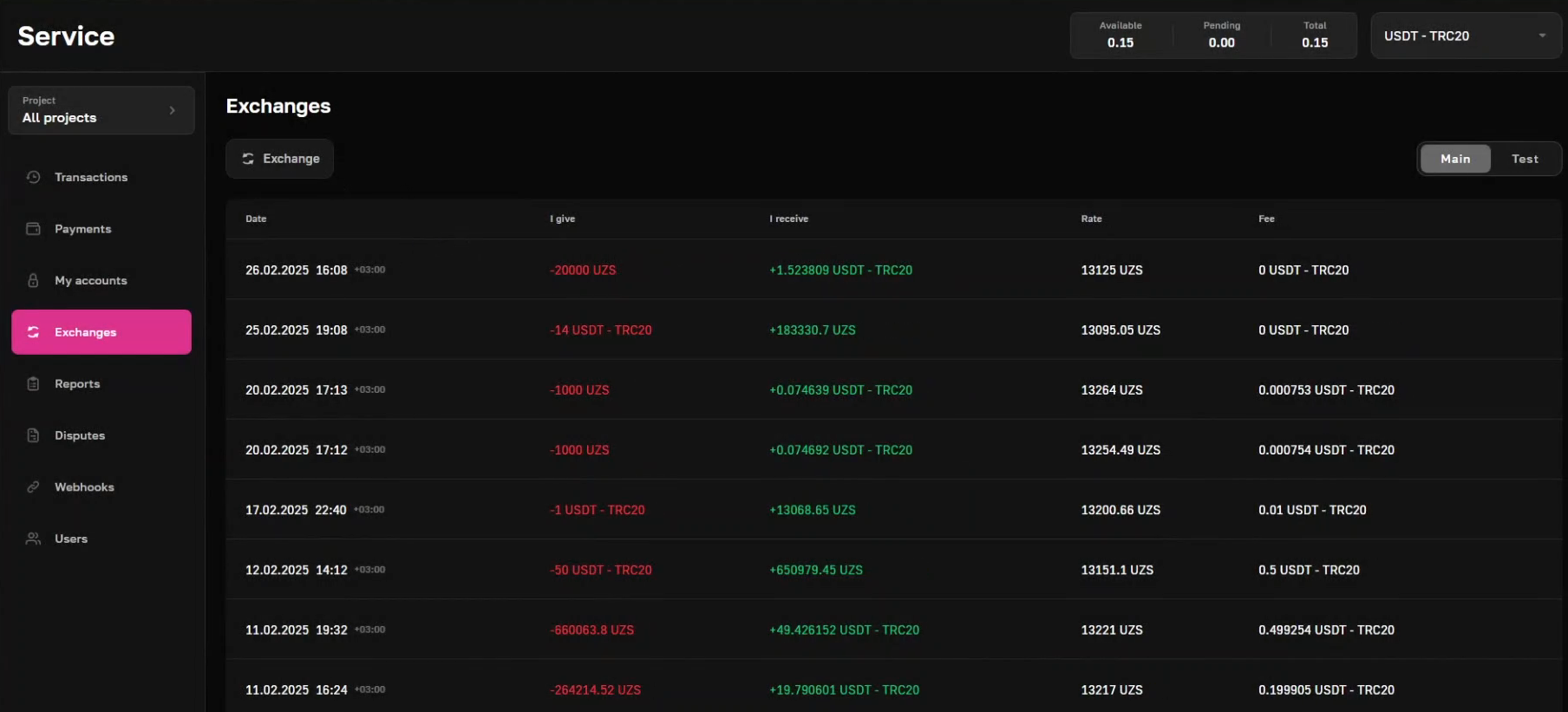 Right after that, you can see the exchange transaction and all the related information in the Exchanges section. The same applies to the Test mode transactions, they are displayed on the Test tab of the Exchanges section: