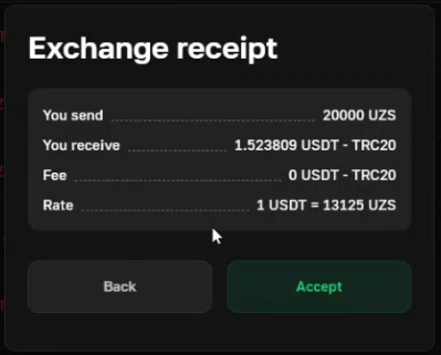 - You'll be shown a dialog with the exchange rate and a fee for the operation. Either Accept it or cancel by clicking Back: